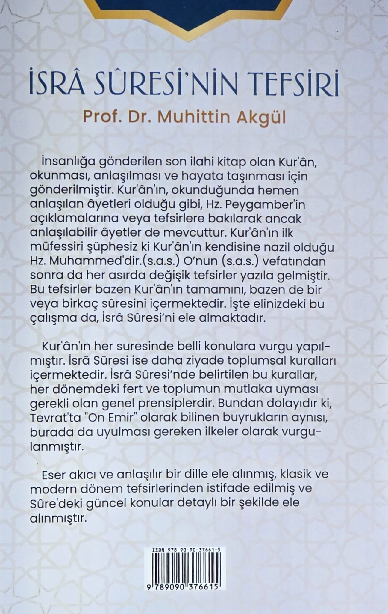 Okuyucusuna, İsrâ Sûresi’nin kapsamlı bir panoramasını sunarken, hem geçmişin yorum geleneğini hem de çağımızın ihtiyaçlarını göz önünde tutan bir bakış açısı kazandırır.